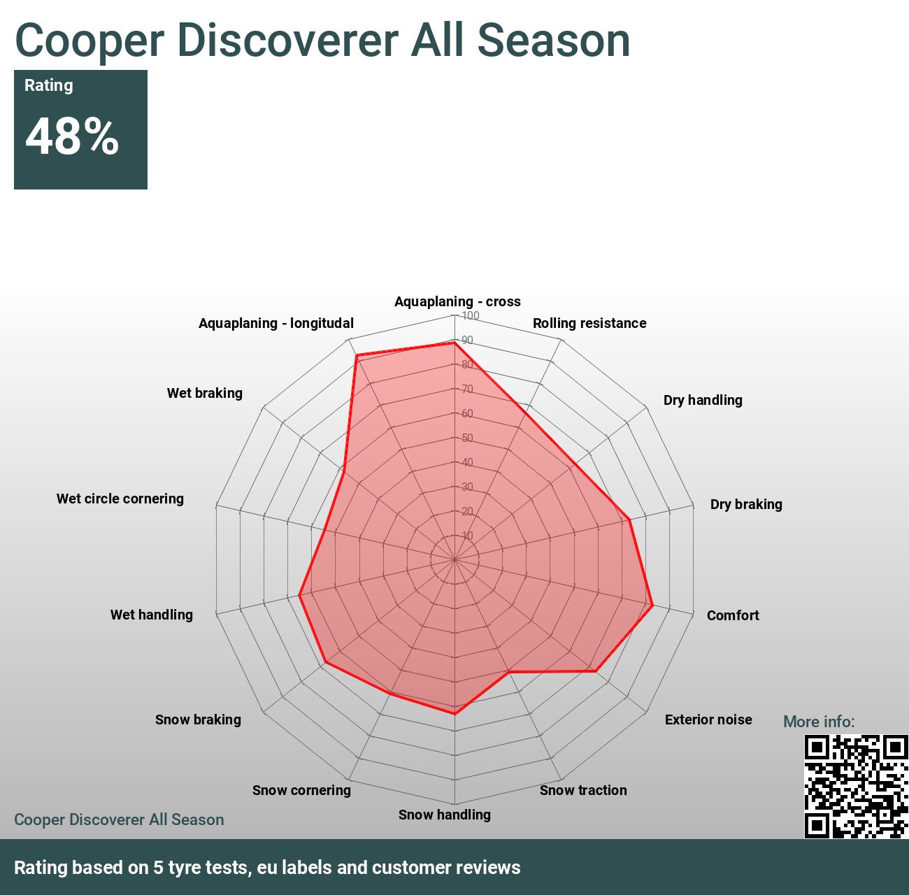 Cooper Discoverer All Season-däcket säkrade 9:e platsen bland alla konkurrenter, vilket gav det en slutlig betyg av 'Tillfredsställande.' Denna utvärdering baserades på en mängd olika prestandamått, där däcket fick beröm för sina korta bromssträckor på snö och mycket god motståndskraft mot vattenplaning, tillsammans med sitt prisvärda pris. Dock kritiserades det också för sitt understyrningbeteende på både snöiga och våta ytor, försenad styrrespons, måttliga komfortnivåer och ökad rullmotstånd. Med sina styrkor framhävdes däcket särskilt inom disciplinerna längsgående vattenplaning och våthantering. Trots blandad feedback visade Cooper Discoverer All Season-däcket sin potential inom avgörande säkerhetsaspekter, vilket gör det till ett anmärkningsvärt alternativ bland sina konkurrenter.